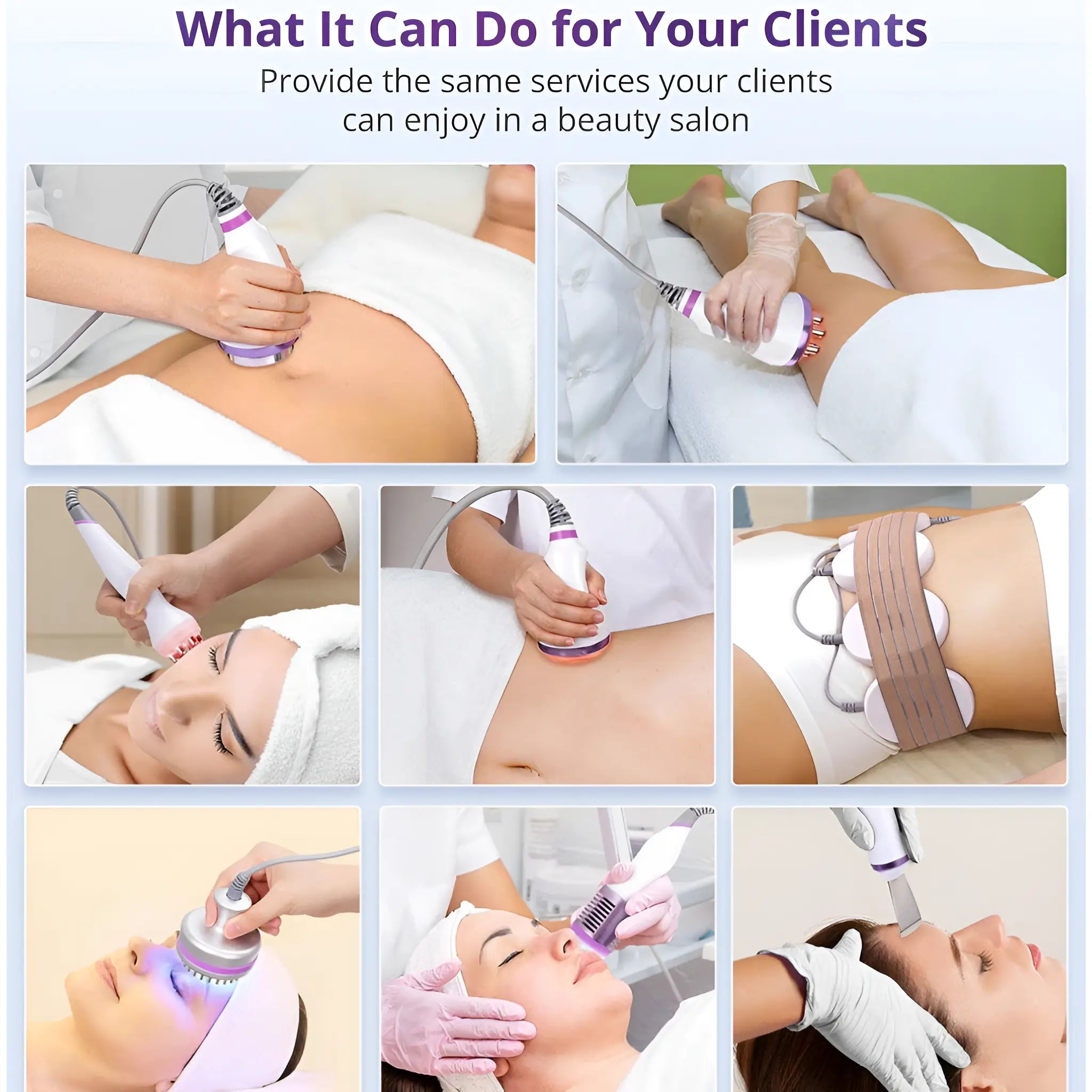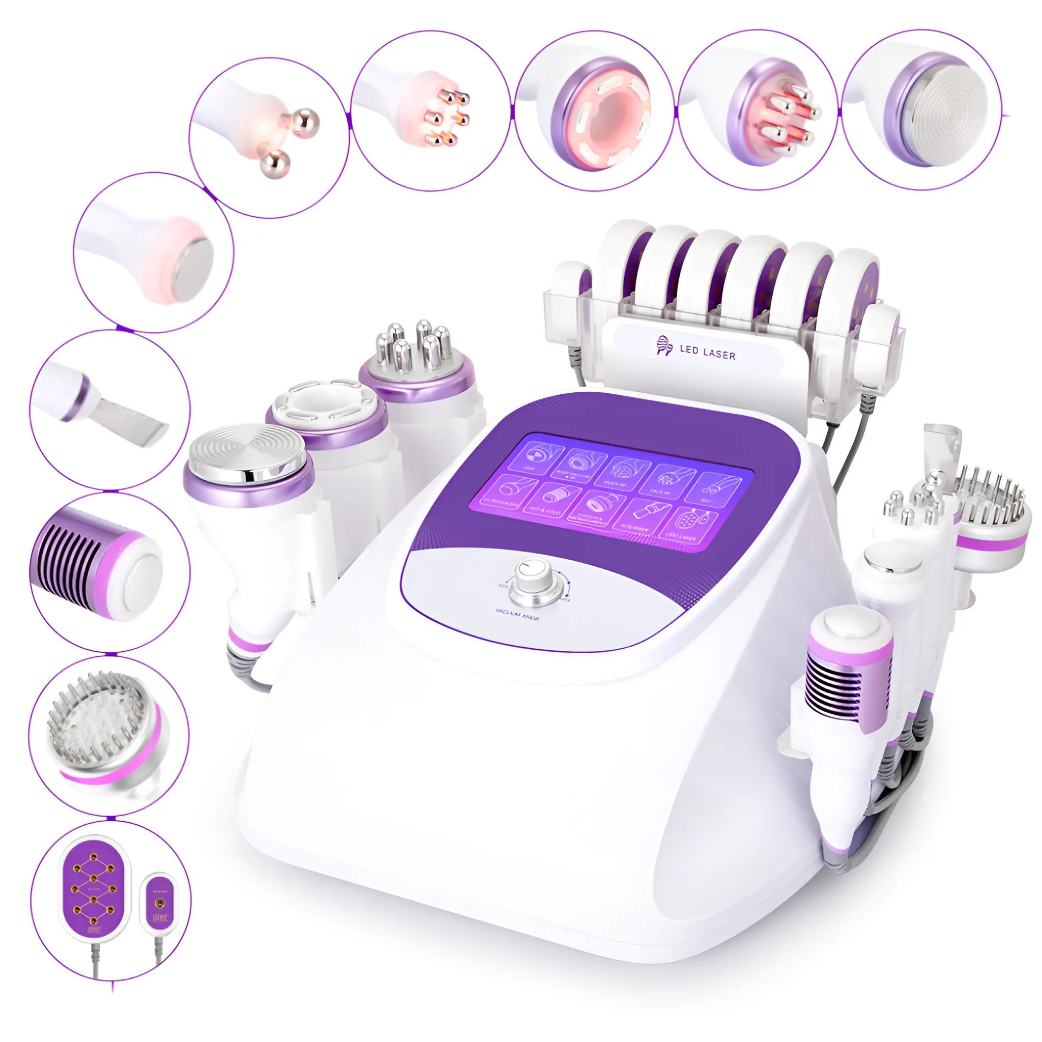 Includes: 40K cavitation, RF handles (2–8 poles), vacuum RF, photon & microcurrent handle, and cold hammer for complete, non-invasive beauty care.