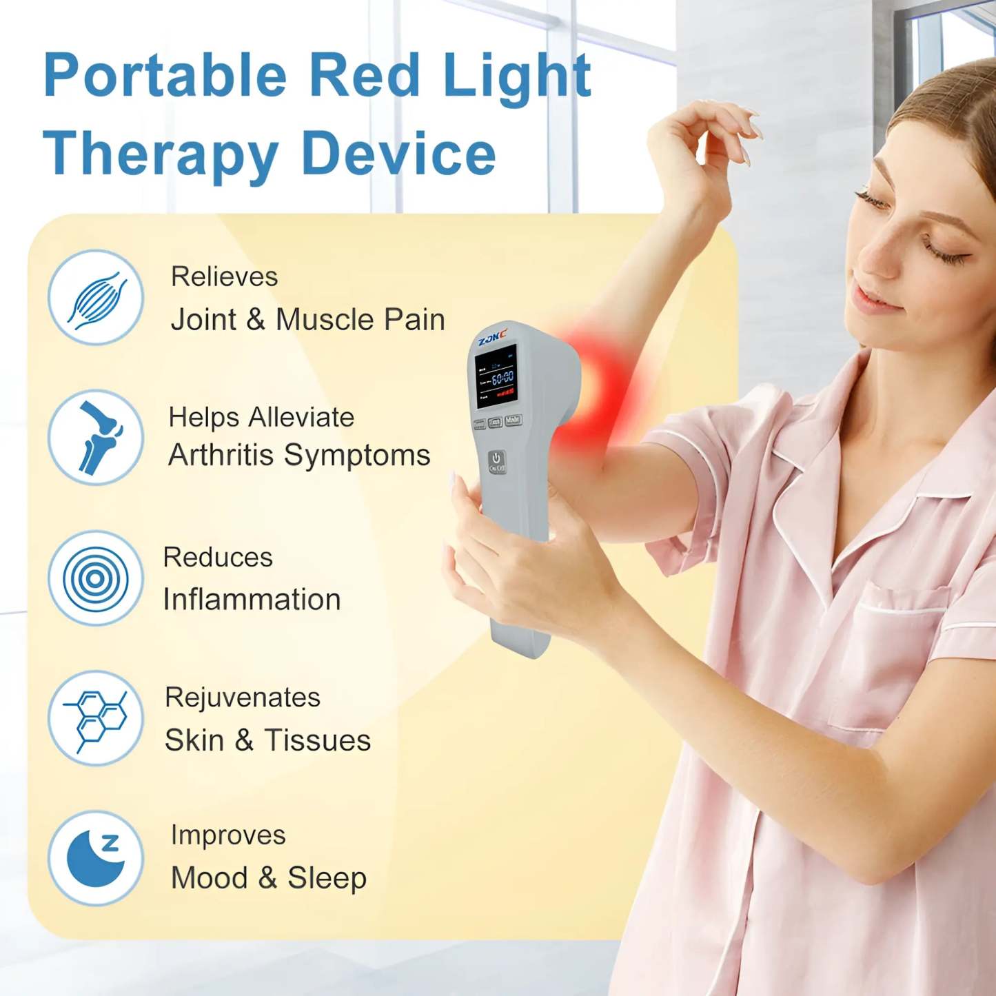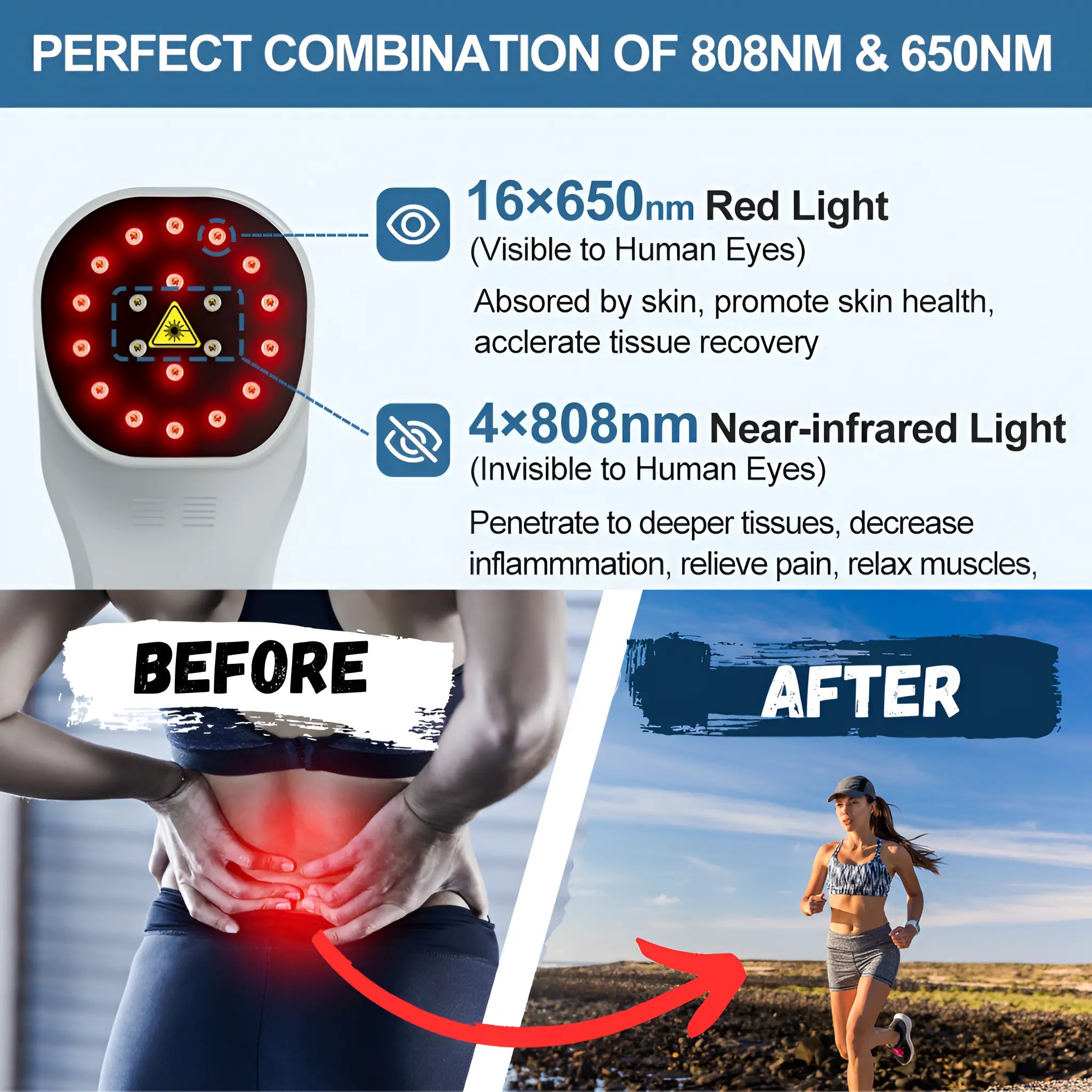 808nm Infrared: Penetrates deep into joints and muscles to support recovery from arthritis, tendonitis, strains, and injuries.