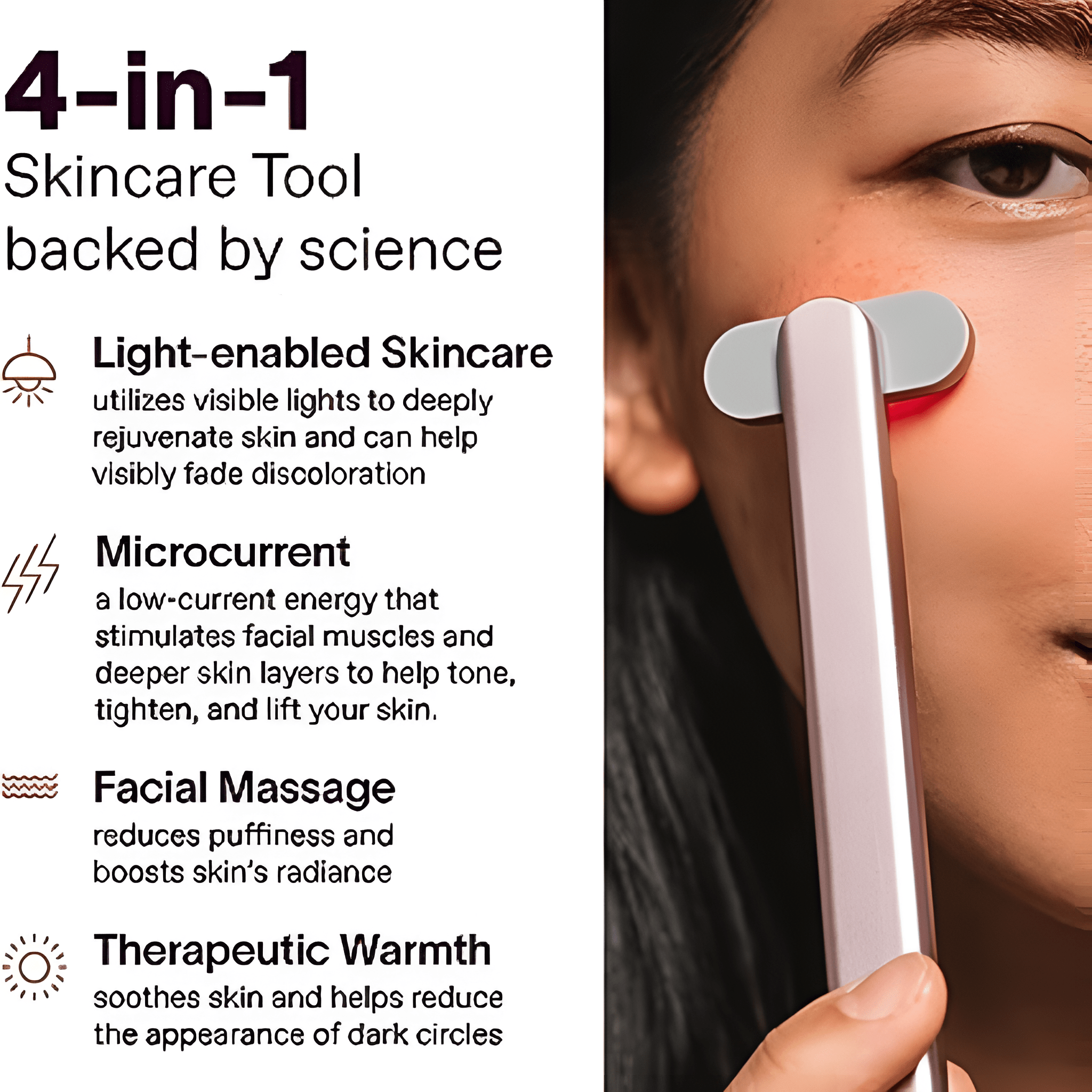 4-in-1 Multifunctional Design: Combines Red Light Therapy and Microcurrent Technology for comprehensive skin rejuvenation.