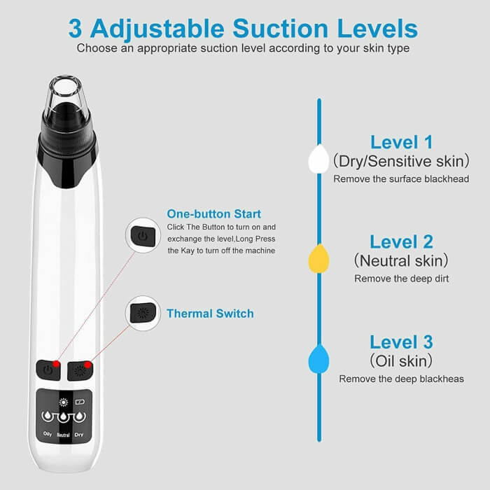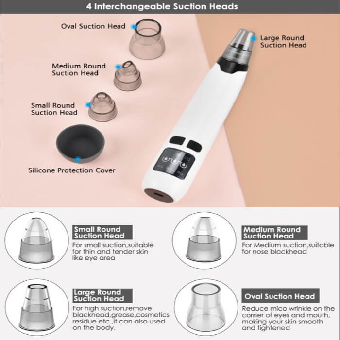 CleanCare - Vacuum Blackhead Remover features four suction heads that gently remove dead skin cells, sebum, and dirt from clogged pores, effectively eliminating blackheads. With three adjustable suction levels, you can easily customize the intensity to your preference. Say goodbye to blackheads and hello to smoother, clearer skin!