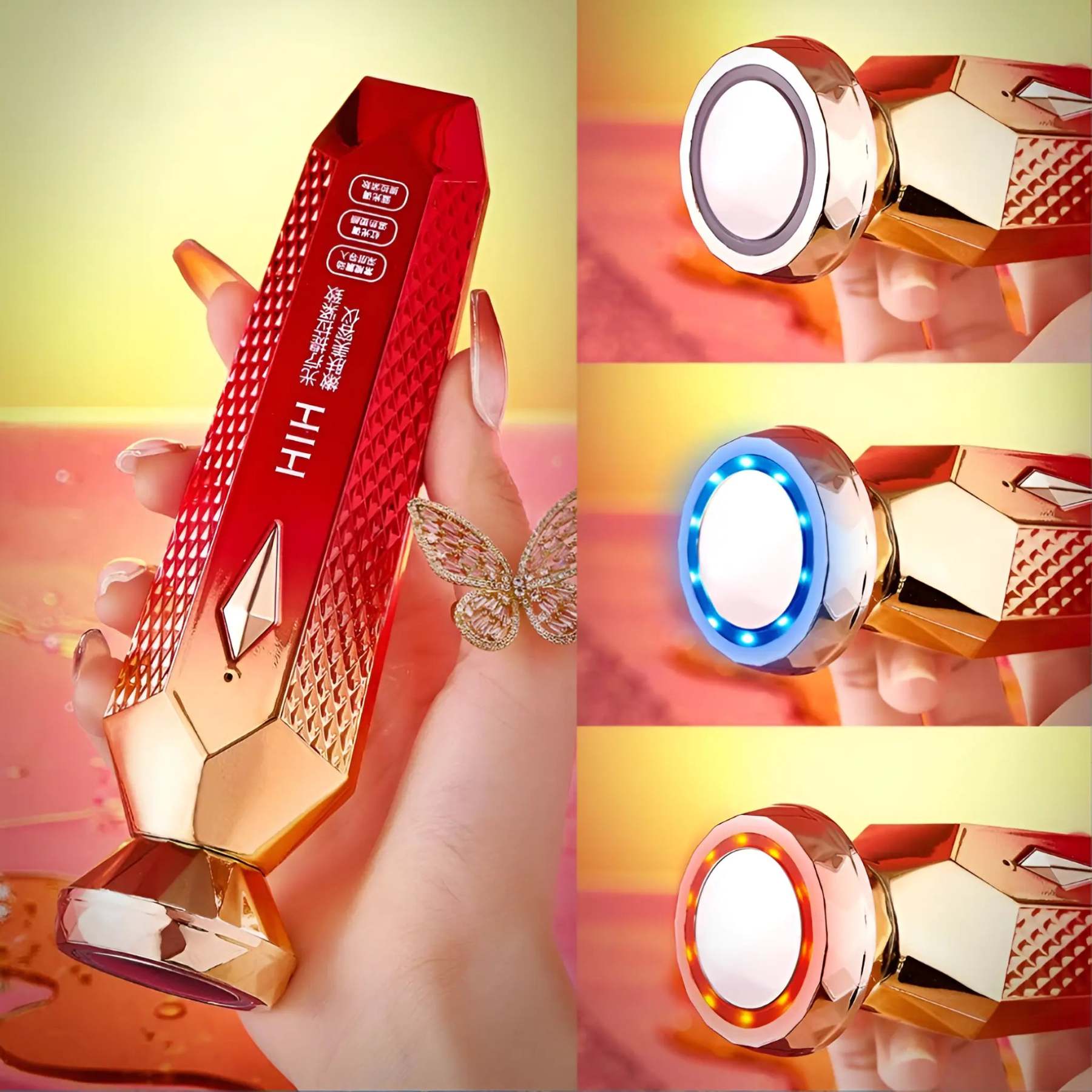 EMS microcurrent lifts and tones, high-frequency vibration energizes deep layers, and red/blue LED light reduces fine lines and rebuilds collagen. Includes 43°C warm RF for enhanced skin rejuvenation